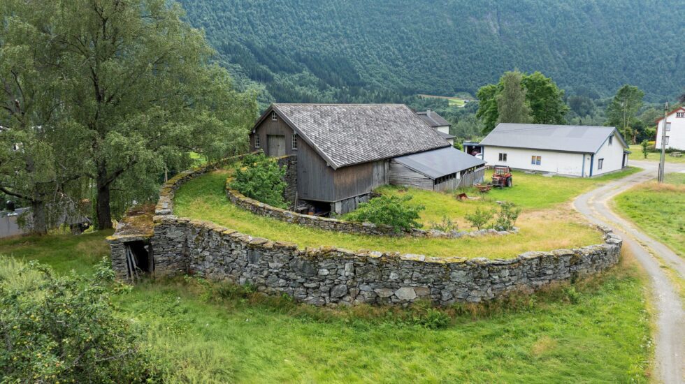 ”Du skal hente så mykje du trur du treng, så skal du ta dobbelt så mykje. Då har du halvparten av det du treng.” Det var rådet Lars Petter gav til ein som skulle setje opp ein mur og spurde kor mykje stein han skulle få tak i. Lars Petter brukte årevis på å hente steinen som skulle til for å byggje køyrebrua med kvelvingen i tillegg til alle murar på sjølve løa. Foto: Trond Heim Johansen, august 2025.