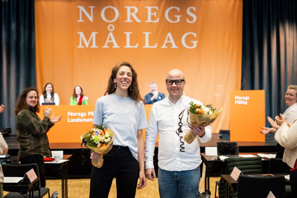 Nestleiar Live Havro Bjørnstad og leiar Peder Lofnes Hauge i Noregs Mållag fotograferte på landsmøtet i organisasjonen tidlegare i år. Foto: Kristianne Marøy.