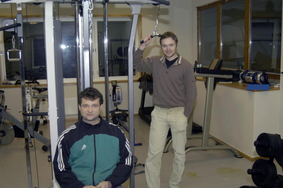 Reidar Kammen (til venstre) og Thomas Grande var for 20 år sidan storleg nøgde med det nye trimrommet i Geiranger, det var lokalisert i det gamle vaskeriet i bygda. Arkivfoto.