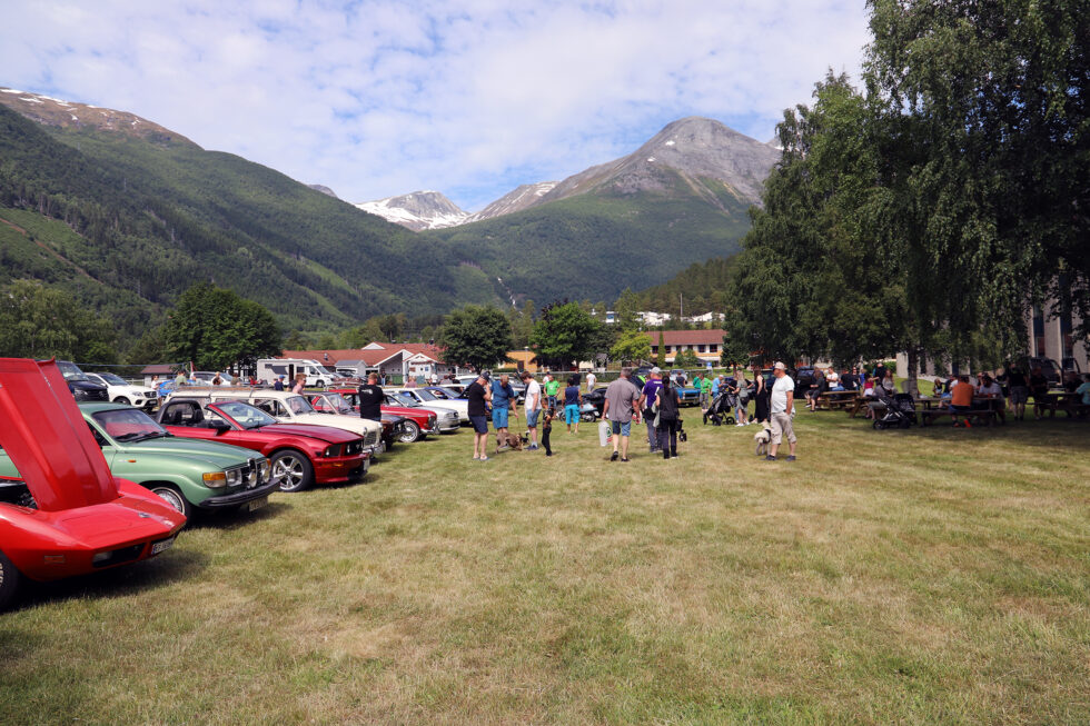 Rådhusmarka vert brukt til mykje; alt frå startområde for mini- og jordbærdilten under olsoklaurdagen til biltreff. Dette biletet er frå eit arrangement i juni 2023, då bilentusiastar samla seg til treff. Arkivfoto.