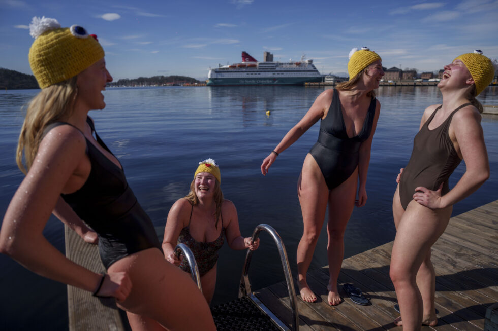 I mars vart det sett ei rekke varmerekordar. Mellom anna kunne osloborgarar kose seg med godvêr i påska, og desse damene tok seg eit bad på Sørenga. Frå venstre: Anna Aamo, Karoline Aamo, Live Aamo og Mina Bjone. Foto: Javad Parsa / NTB / NPK.